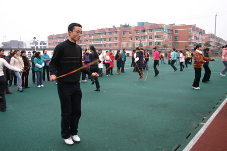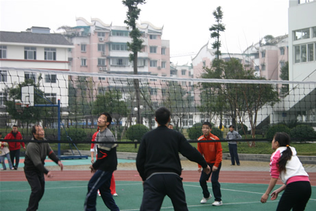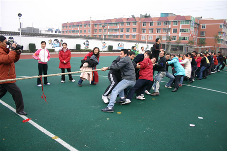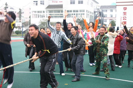 下午是全体教职员工的运动会。全校的员工分成红、黄、蓝、绿四个队,开始了友谊第一、比赛第二的竞争。跳绳、障碍接力跑、拔河、排球、投篮,一项接一项,比的是团结与合作,赛的快乐和喜悦,增进的是了解和友谊。