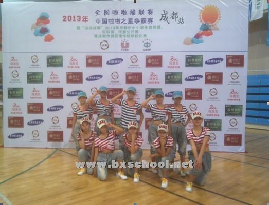2013年全国啦啦操联赛中国啦啦之星争霸赛成都站,暨“运动成都”2013年成都市中小学生健美操、啦啦操、街舞公开赛,暨成都市健美操传统学校比赛于2013年10月12日在成都西南交通大学体育馆拉开战幕。本次比赛由国家体育总局体操运动管理中心、中国大学生体育协会、中国中学生体育协会主办;由成都市体育局、成都市教育局、成都市健美操协会、成都大健康体育文化传播中心等承办;成都西南交通大学协办;共有来自西南片区近百所中小大学、近千余名运动员参加。 为了参加这次比赛,同学们克服了重重困难,坚持每天训练,不厌其烦地练习动作的一致性。她们怀着必胜的信念,带着对比赛的渴望,对动作质量精益求精,在动作难度上不断挑战自我,勇于突破。10月12日,在成都西南交通大学健美操比赛中,我校啦啦操代表队从一出场就吸引了所有人的眼球,她们饱满的激情、整齐的动作、丰富的表现力感染了在场的所有人。 最终我校啦啦操队以成都站啦啦操二级街舞规定动作第一名的成绩进入全国总决赛。