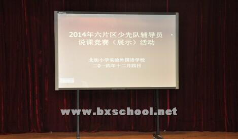 2014年12月4日,在北街小学实验外国语学校开展了都江堰市六片区少先队辅导员说课竞赛活动。参加此次活动的有北街小学、北小实外、奎光小学、团结小学、李冰小学、虹口小学、新建小学的辅导员老师们。 此次活动通过了优秀少先队活动案例说课和微队会两种形式展示各校德育工作的成果,交流区片少先队工作经验,有力推动少先队社会主义核心价值观教育活动深入的开展。 首先,进行的是说课竞赛的展示。各校参赛的辅导员老师们都做好了充分的准备,按照12月1日抽签的顺序依次做了展示。1号选手是我校的贾廷廷老师,她所讲的主题是《插种幸福的种子》。从活动目的到活动过程通过讲解、图片以及视频等环节诠释了友善和谐的主题;北街小学、团结小学和奎光小学的辅导员老师们也纷纷从不同活动环节来诠释了社会主义核心价值观的含义。 接着,是微队会竞赛的展示。各校参赛的老师们通过现场从核心价值观二十四字里抽题、抽班级,临时做微队会准备,然后在学术厅进行展示,检验了辅导员老师们扎实的辅导能力。 最后,说课竞赛进入决赛的有北街小学的黄学老师和我校的贾廷廷老师;微队会竞赛进入决赛的有北街小学的李燕老师和团结小学的张惠老师。 本次活动,充分展示了我片区先进的教育理念和辅导员较强的队会设计能力,有效落实了社会主义核心价值观的内容。
