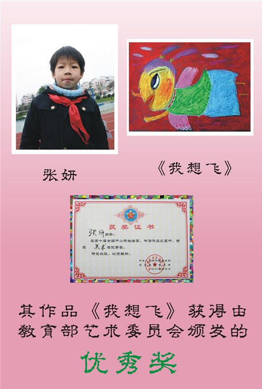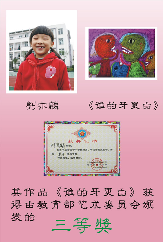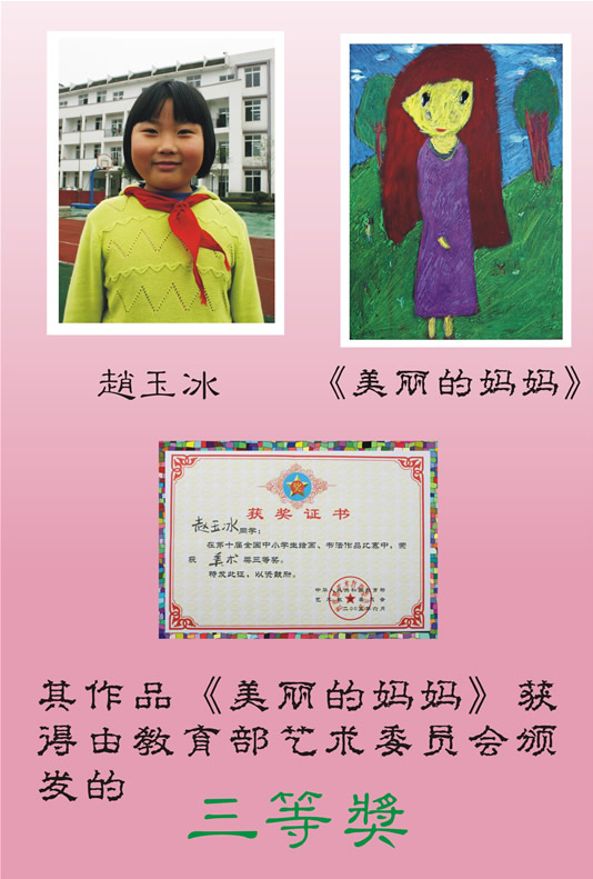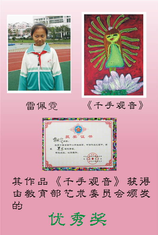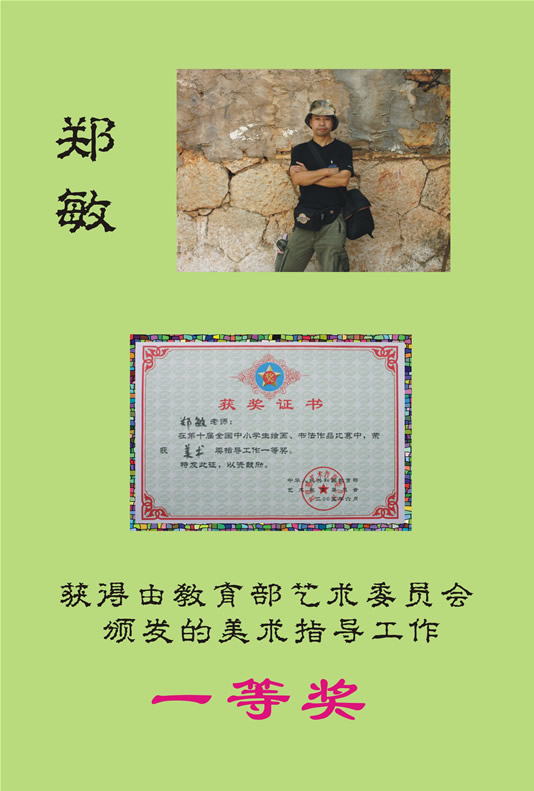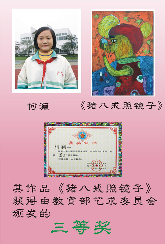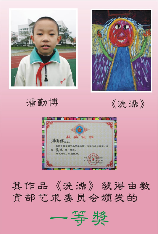 金秋十月,喜报频传,今年6月北小实外的十名同学参加由中华人民共和国教育部艺术教育委员会主办的“第十届全国中小学生绘画、书法作品比赛”全部获奖。其中潘勤博同学荣获美术类一等奖,王玉梅同学获美术类二等奖,有五名同学获三等奖,其余几位同学获优秀奖。因获奖面100%,成绩突出,北小实外的美术教师郑敏老师荣获美术类指导工作一等奖。