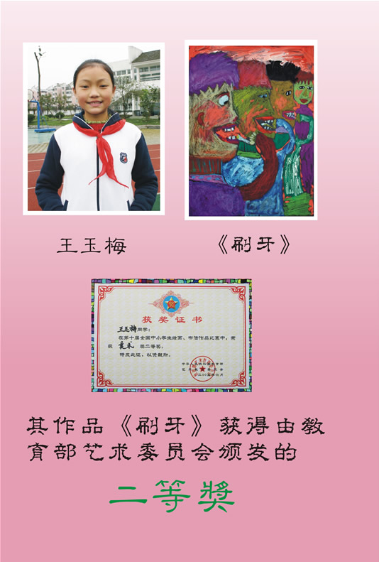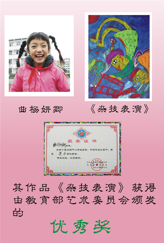 此次获奖是继我校8名学生参加在北京由全国少工委、中国少年科学院主办的“争当小实验家”全国青少年科学体验活动总决赛获3金3银2铜牌、全部获奖后的又一大丰收。这充分体现了北小实外注重学生全面发展,艺术教育效果显著,成绩喜人。