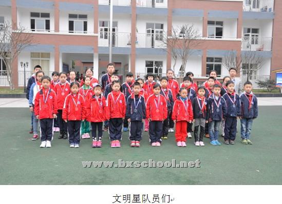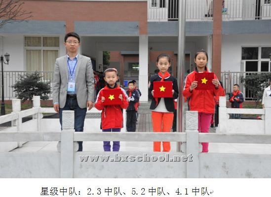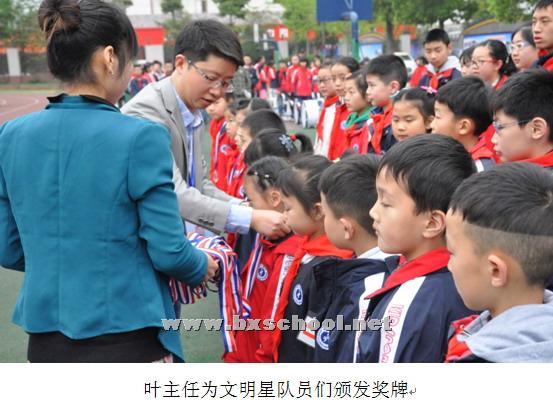 2015年3月30日早上8:15分,我校全体师生齐聚操场,举行了隆重的学月颁奖仪式,表彰了第一学月的优秀班级和优秀同学,他们将成为3月的“星级中队”和“文明星队员”。 在老师们的带领下一群群可爱的孩子们认真学习,努力实践,为成为“儒雅智慧”的北小实外人而不懈努力,不仅勤奋学习,还具有良好的品格。很多班级整体风貌,很多同学的行为习惯都有很大的进步,为形成良好的校风和学风树立了榜样,启到示范作用。 升旗仪式上,2.3中队、4.1中队、5.2中队获得第一学月 的“星级中队”, 1.1中队王振轩、1.2中队刘力洁、1.3中队余明珍、1.4中队李羿暄、1.5中队骆俊豪、2.1中队文艺霏、2.2中队潘馨锐、2.3中队张皓瑞、2.4中队李芷祺、2.5中队余诗维、3.1中队杨素兰、3.2中队李泽鑫、3.3中队杨景涵、3.4中队梁沁悦、3.5中队唐志远、4.1中队陈凌霄、4.2中队刘晓、4.3中队黄于珈、4.4中队祝梓桐、4.5中队李天辰、5.1中队苏畅、5.2中队向歆悦、5.3中队潘子欣、5.4中队王烁、5.5中队王嘉垚、5.6中队何启雯、6.1中队李之一、6.2中队戚中宇、6.3中队泽旺、6.4中队徐静萱、6.5中队孔寒获得了“文明星队员”称号。由德育办叶主任为他们颁发五星徽章和奖牌。全校同学雷鸣般的掌声是对文明星队员们和星级中队的最热烈的祝贺。