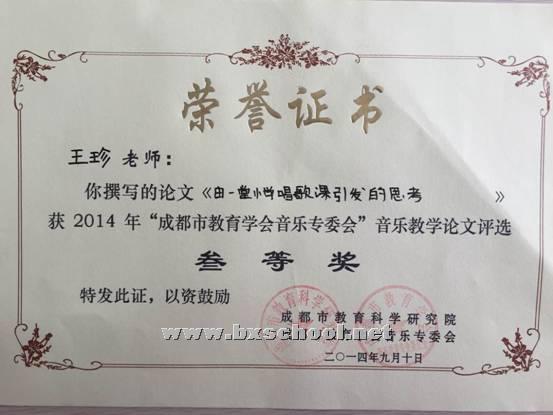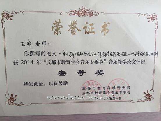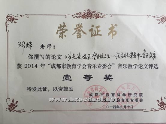 热烈祝贺我校音乐教师在成都市教育科学研究院、成都市教育学会音乐专委会联合主办的,“2014年成都市教育学会音乐专委会音乐论文评选中”获得佳绩。 其中邓烨老师的论文《为点滴喝彩,塑自信人生——谈高效课堂中的赏识教育》获得一等奖;王珍老师的论文《由一堂小学唱歌课引发的思考》获得三等奖:王萌老师的《音乐新课标理论下如何打造音乐高效课堂——以《音乐小屋》一课为例》获得三等奖。 我校音乐组是一个团结向上,乐于研讨的团队。在学校教学工作的总纲指引下,音乐组从新课标的学习到随堂课的听评,从每周理论学习到研究课、汇报课、精品课的打造,一步一个脚印,踏踏实实做好研究工作,所以组上成员成长很快,并取得了一个个较好的成绩。我们将再接再厉,争取更上一个新的台阶!