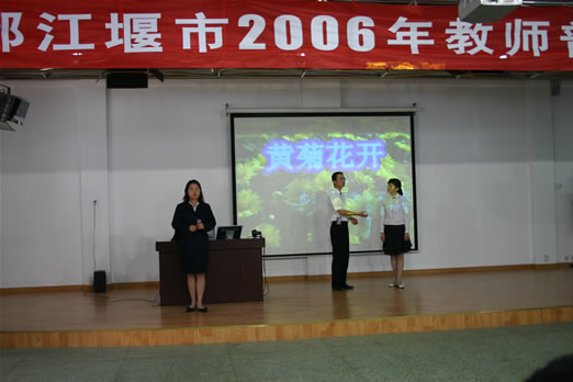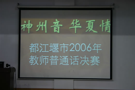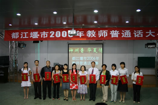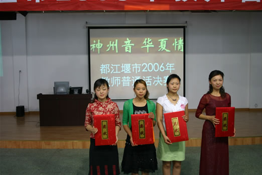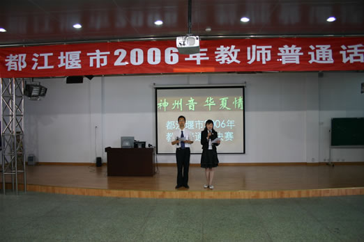 4月29日下午,“神州音 华夏情”2006年都江堰市教师普通话决赛在北小实外举行,进入决赛的全市各中小学19支代表队各显神威,充分展示了我市教师的语言、普通话功底。经过激烈的角逐,北小实外校的余娟、李坤、李培娟三位老师以一篇《黄菊花开了》勇夺特等奖。按照比赛规程,他们和另一名特等奖获得者将代表都江堰市到成都市参加决赛。