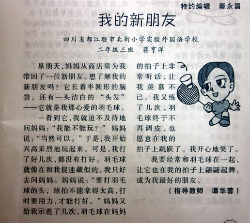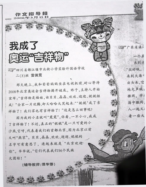 自从去年学校开展了“书香校园”读书活动以来,时时处处,都可以看到孩子们在书海中自由自在地遨游,像一只只勤劳的小蜜蜂,贪婪地品尝着知识带来的缕缕芬芳。如今,他们已经不仅仅是品味,有的还开始初显身手,获得了成功!瞧,二年级(3)班的蒋亨洋的《我的新朋友》、雷佩霓的《我成了奥运“吉祥物”》分别发表在《小学生文学社作品选》和《作文指导报》上!“小荷才露尖尖角”,祝愿两位能干的孩子,百尺竿头,更进一步!同时也希望我们全校的孩子,都把自己的好文章推荐出去,让我们共同分享你们成长的快乐!