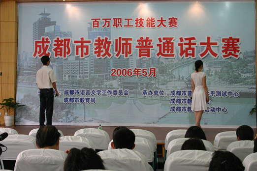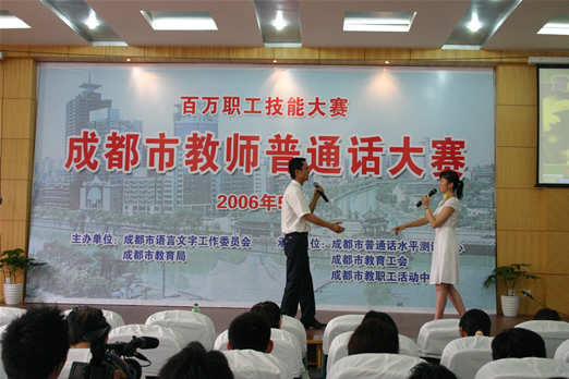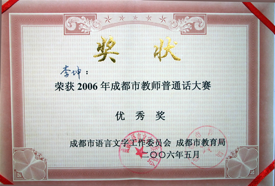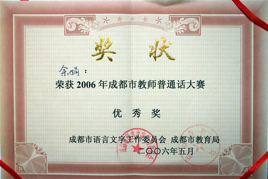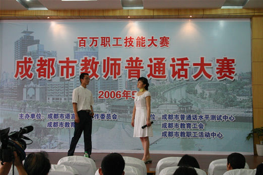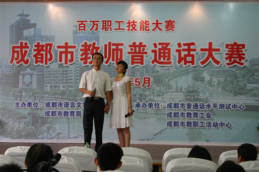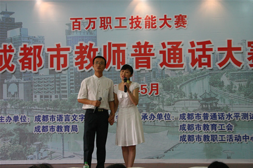 5月26日,我校余娟、李培娟、李坤老师代表我市参加成都市教师普通话大赛。成都市共有74支代表队参加本次角逐,我校的《黄菊花开》获得92.88的好成绩,位居第15名,最后因超时扣分,而荣获优秀奖,在此向他们表示祝贺,并在今后的活动获得更优异的成绩!