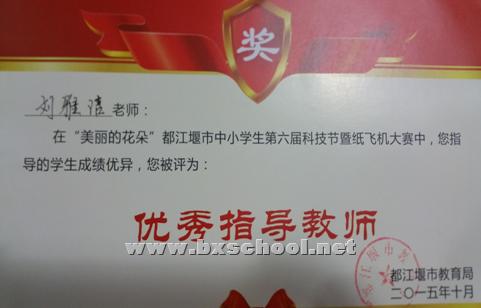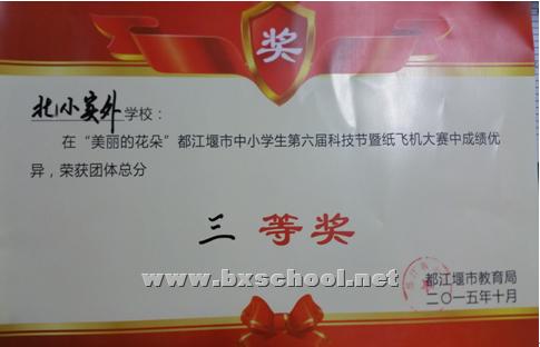 在“美丽的花朵”都江堰市中小学生第六届科技节暨纸飞机大赛中,我校荣获团体总分三等奖,我校学生李响获得直线飞行赛二等奖、学生石弘毅获得奥运五环靶标赛三等奖、学生何川江获得悬浮留空时间赛三等奖,我校科学教师刘雅洁被评为优秀指导教师。 通过这次纸飞机大赛同学们体验了成功的喜悦与失败的磨练,既愉悦了心情、释放了压力,同时也锻炼了动手与合作的能力,培养了同学们的集体荣誉感和团队合作意识,我们收获了希望,收获了梦想,收获了喜悦。