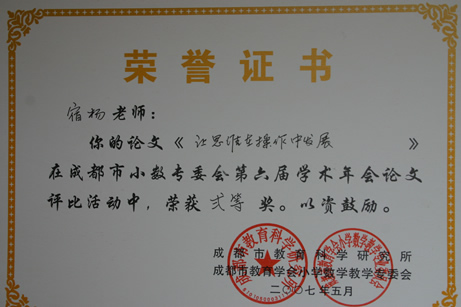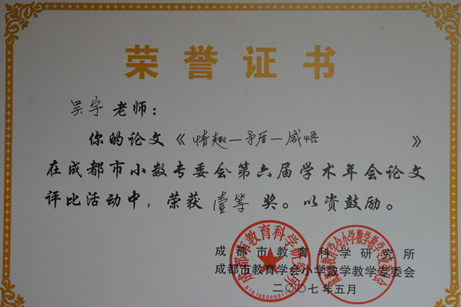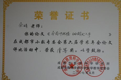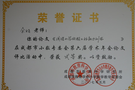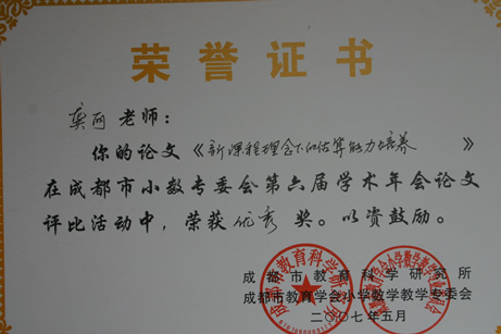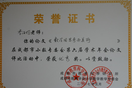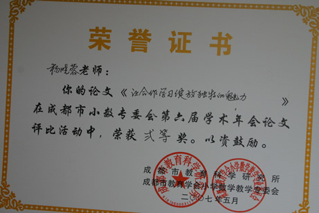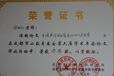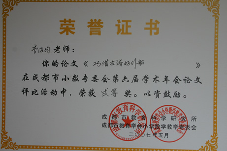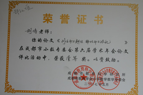 暨华赛、奥赛取得优异成绩后,我校数学组又传来新的喜讯。在5月刚刚结束的成都市第六届小学数学年会论文评比中,我校数学组报送的14篇论文中有12篇获奖,其中一等奖3篇,二等奖4篇,三等奖3篇,优秀奖2篇,获奖数量和级别均名列都江堰前茅。