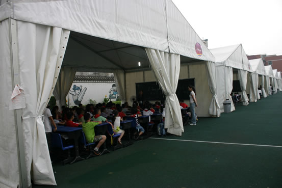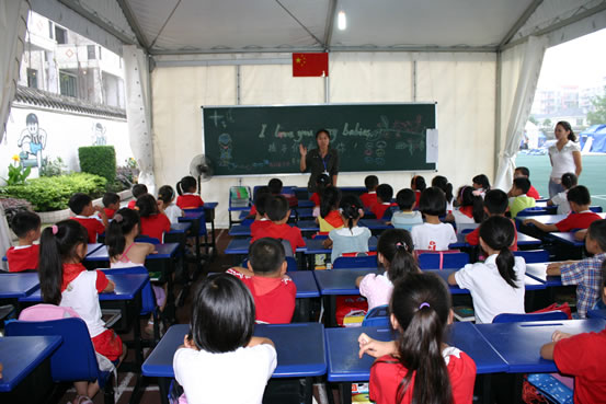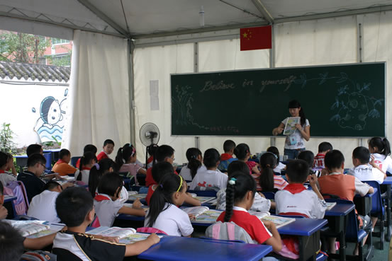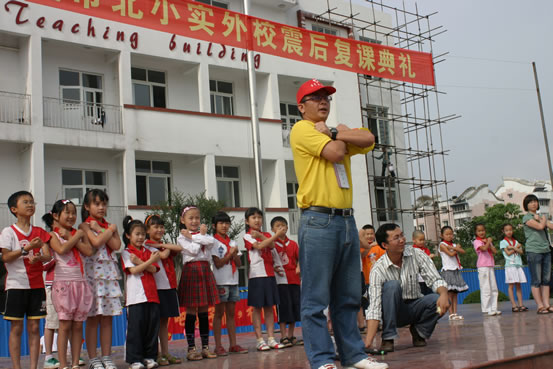 6月16日清晨,北小实外校在学校抗震救灾领导小组强有力的领导下,在社会爱心单位的支持下,通过全体教职工的共同努力,震后复课升旗仪式在操场上隆重举行。十二个帐蓬教室中又传出了朗朗的读书声......。福建省青年志愿者心理援助服务队的专家、学者深入课堂、办公室对师生进行了震后心理辅导。