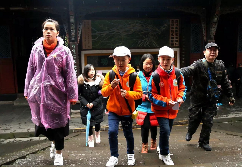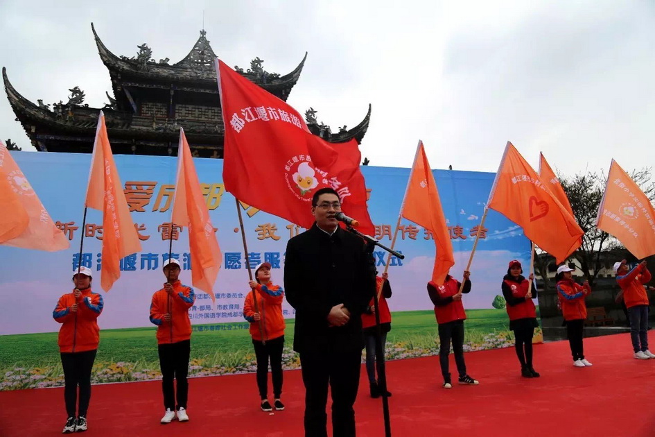 都江堰市委常委、宣传部部长唐小峰向小伙伴们宣布都江堰市旅游志愿者出征,并提出殷切希望。