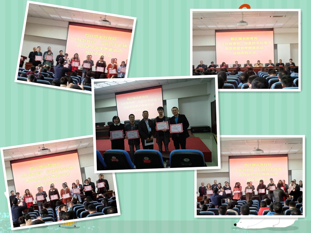 都江堰市信息技术环境下高效课堂教学赛课活动圆满结束。我校5个学科的青年教师一路过关斩将,最终脱颖而出,并于3月22日在教育局举行的总结表扬大会上接受表彰: