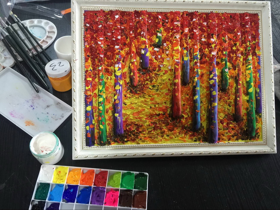 比赛第一天上午为剪纸,要求以脸谱为元素,利用综合材料进行组合和再创作,下午是国画人物。第二天是以风景为主题进行创作。王丽和苏畅老师发挥自己的专业特长,利用自己擅长的手法进行创作,苏畅老师画的小写意,王丽老师画的工笔;苏畅老师以荷花为题材创作了一幅油画作品,王丽老师以超轻粘土和丙烯颜料为媒介创作了一幅风景树。两位老师在规定的时间内完成了美术作品,而且受都了其他美术老师的称赞。