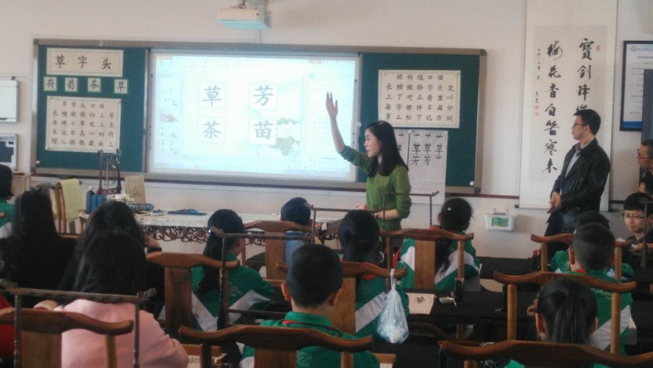 第二堂课由我校赵蕾老师带来的软笔书法课《草字头》的书写,在这节课中,赵蕾老师教态自然、语言简洁,孩子们情绪高涨,兴趣盎然,在愉悦的气氛中掌握书写要领。