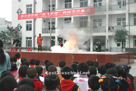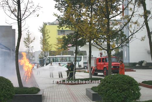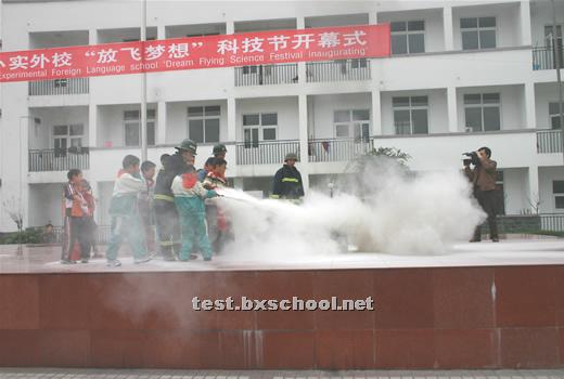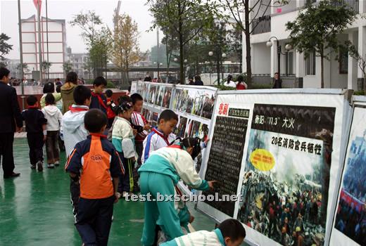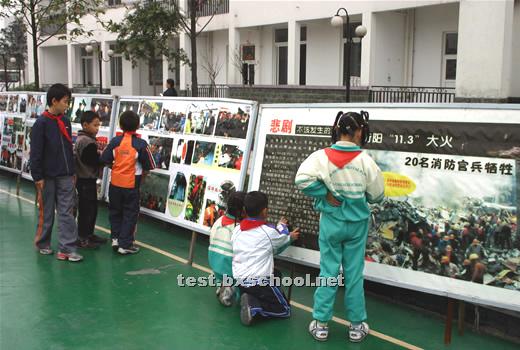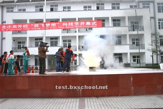 警报声声,烟雾腾腾,火焰雄雄,11月9日,119消防日,北街小学实验外国语学校举办了消防知识展览,并在都江堰市消防中队武警官兵的指导下成功举行了在紧急情况下安全撤离楼房的消防演习。 消防展览在学校操场展出,师生们踊跃前往参观,看见一个个火灾惨景,不断警醒着大家,一定要注意防火。展览中的消防知识更让大家提高了火灾的防范意识。 下午3点,各班学生正在教室里下课,突然警报声声刺人耳膜,烟雾从教学楼腾腾而起,弥漫开来。有的孩子惊呼起来,很快,短短的几秒,班主任老师和下班老师招呼着大家,组织同学们迅速而有序地从教室里向楼外楼下撤退。每层楼楼道口负责安全监督的老师大声提醒着师生不要惊慌,安全有序地下楼。不到五分钟全校近千师生员工全部安全撤到了运动场上。警报声仍然呼叫着,消防车红灯闪烁,武警消防队员背负氧气瓶头戴防毒面具表层逐层楼逐个教室检查了撤离情况。运动场上老师们认真仔细地清点了人数,撤离教学楼的消防演习取得圆满成功。 演习一结束,消防中队的武警官兵叔叔给师生们演练了湿麻袋灭火、干粉灭火器灭火,做了详细解说。并让部分老师和学生上场进行实际操作。很快大家掌握了要领,把地上的大火一次次扑灭。接着消防官兵又演示了消防车水龙灭火。一堆油浸的木柴雄雄燃烧起来,火焰冲天,消防官兵沉着熟练地握紧水龙头,对准火焰,从下往上,刹时就将大火扑灭了,操场上响起来了热烈的掌声。 夏代成校长代表学校全体师生衷心感谢都江堰市消防中队的武警官兵给予北小实外的指导和精彩的演示。他希望大家一定要增强安全意识,学习掌握在紧急情况下的安全防范知识,提高防范能力,警钟长鸣,使我们的校园学习生活平安顺畅。