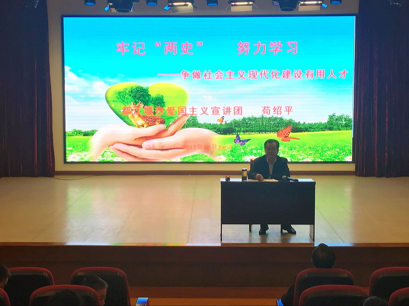 On the afternoon of October 24th,ourschool invited Gou Shaoping from the patriotic propaganda group ofDujiangyan,to give a patriotic knowledge lecture with the theme of "twohistories and hard study" as a theme for students.