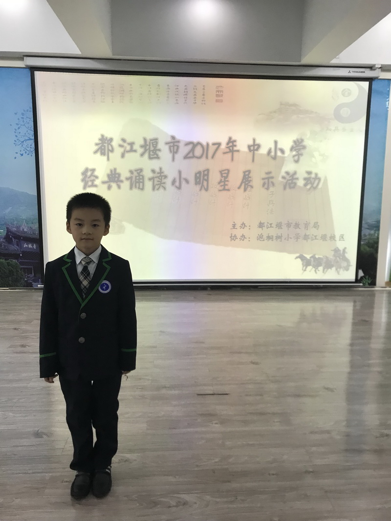 在都江堰市诵经典比赛中,我校三年级小选手唐振轩朗诵了一则《论语》。虽然只有八岁,但是他一点也不慌张,虽然只是短短的几句论语,但是他声情并茂、抑扬顿挫,加上背景音乐的烘托。恰当的肢体语言辅助,把平凡的文字演绎的绘声绘色,仿佛身临其境与古人对话。唐振轩的诵读获得与会评委的一直认可,将代表都江堰市赴成都参加中小学学生参加成都市2017年书法颂经典活动。