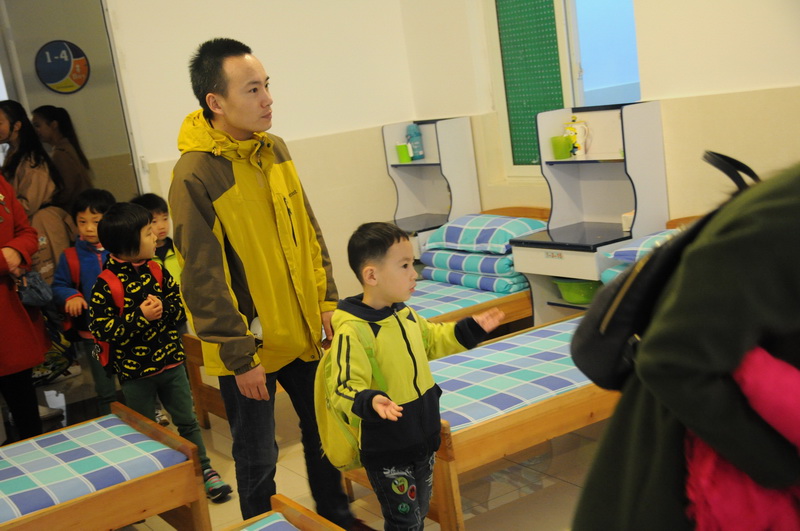 然后,小朋友们来到了哥哥姐姐们的宿舍。小朋友和家长们对如此整洁的床铺都赞叹不已,生活老师告诉他们这都是一年级的孩子们自己整理的。