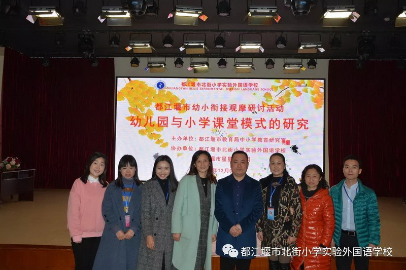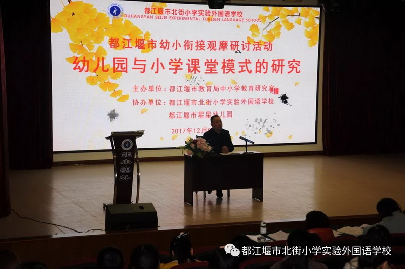 2017年12月6日,都江堰市幼儿园园长、骨干教师和一年级教研组长、英语教师在我校学术厅参加幼儿园与小学课堂模式研究活动。