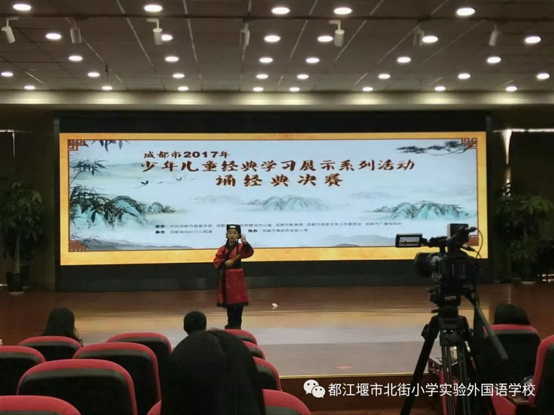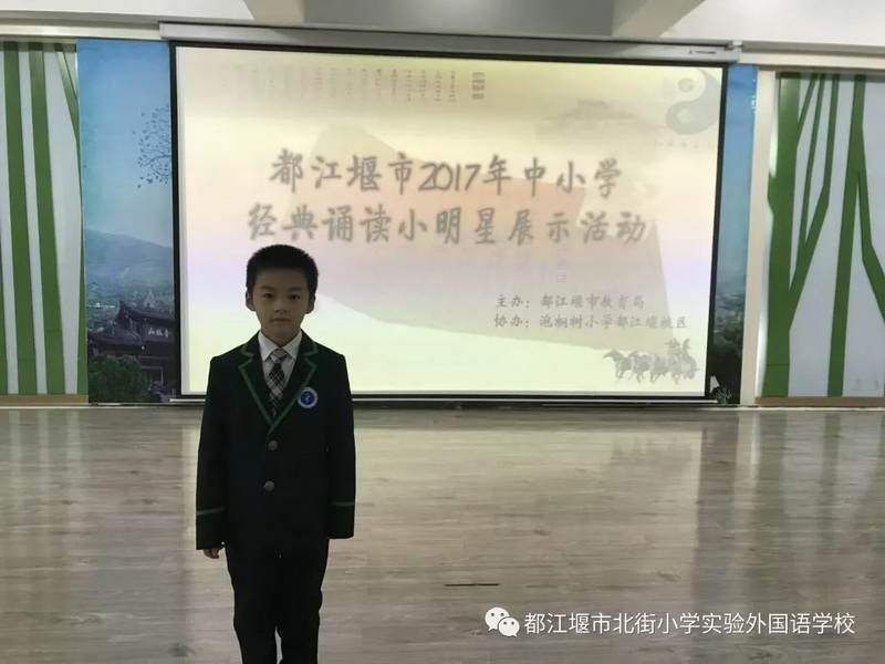 2017年成都市少年儿童文学经典学习系列活动,我校3.4班学生唐振轩由都江堰市教育局推选,代表我市小学组学生参赛,获成都市“诵经典”比赛“一等奖”,并受邀参加主办单位在四川电视台的“颁奖盛典”晚会,与来自不同区、县的十一名一等奖获得者,一起表演了节目《少年中国说》。此次“颁奖盛典”将于2017年12月30日19点,在CD-6播出。
