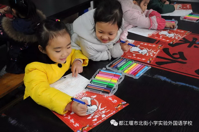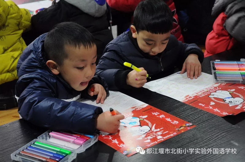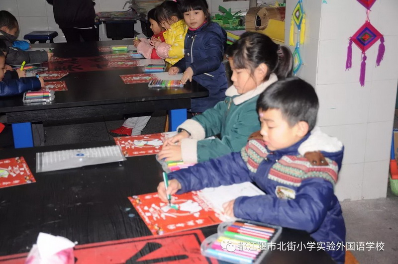 最后,孩子们来到美术室,和我校美术教师一起体验彩色的世界,由他们亲自填涂的《旺旺吠财》年画将作为迎新礼物,送给家长!
