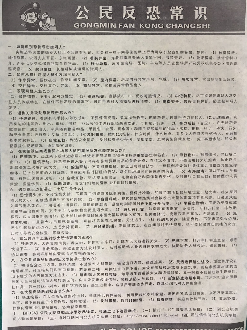 For primary and middle school students, it’snecessary to popularize the knowledge ofAnti-riot and anti terrorism. Our school supported such activity.After theteachers and students learned the leaflets ,students were asked to take themhome,and learned with their parents together ,which gave parents a chance tolearn common sense of anti-riot and anti terrorism . When the violence happened,they can deal with emergencies calmly, the damage of violence will be reduced to aminimum.
