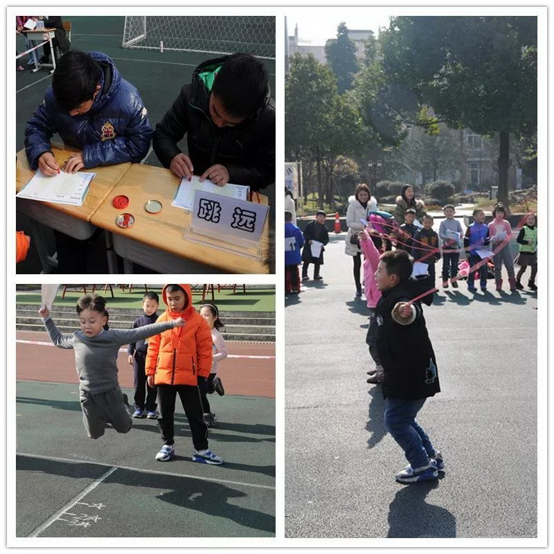 在“体育节”孩子们比一比谁跳绳厉害、谁跳得更远。