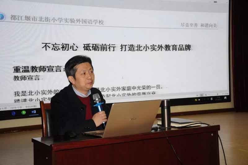 In the first stage of theplenary session, Principal Ma Changjun gave us the report “ Don’t forget why we started and move forward bravely---- Building the education brand of Beijie Experimental Foreign Language School”. In his report, Principal Ma first led the faculty to revisit theteacher's declaration, emphasizing the school culture of "the best and thebest, the harmonious to the United States",“Developing multi intelligence, achievethe success of difference, sharing the happiness of growing up". Toachieve the vision of running a school which is "students like, teacher ishappy, parents are satisfied, peer praise, social recognition, the government trust". Then, he done a comprehensive and detailed deployment guidance andsweep down irresistibly from a commanding height in eight aspects which are "safety,health, quality, curriculum construction and teaching staff development,student development, campus promotion, harmony between home and school.