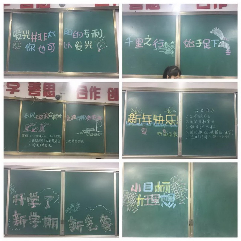 1、开学的第一天各班级的班妈、班爸们已经在教室黑板上写好了欢迎孩子回家的话语。