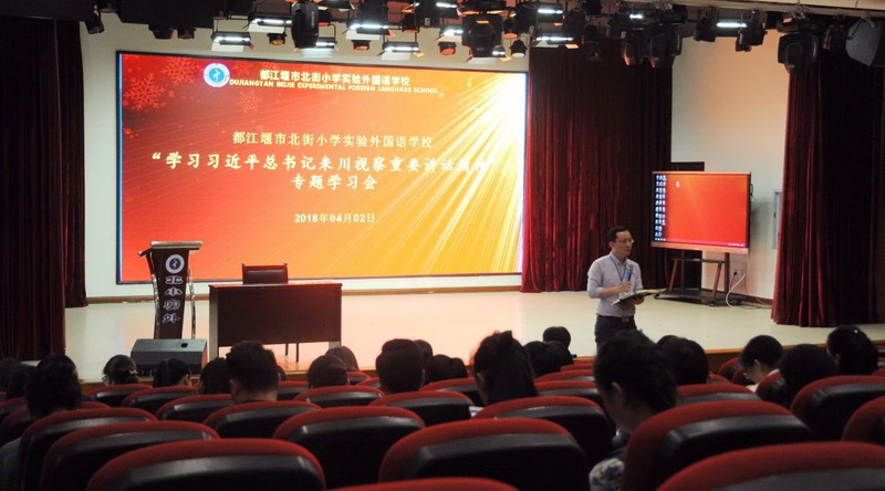 4月2日,北街小学实验外国语学校开展“学习习近平总书记来川视察重要讲话精神”专题学习。学校组织全体教师通过观看视频、文字展示认真学习了讲话精神,强调要把深入学习贯彻“习近平总书记来川视察重要讲话精神”落实到学校的教育教学工作中。