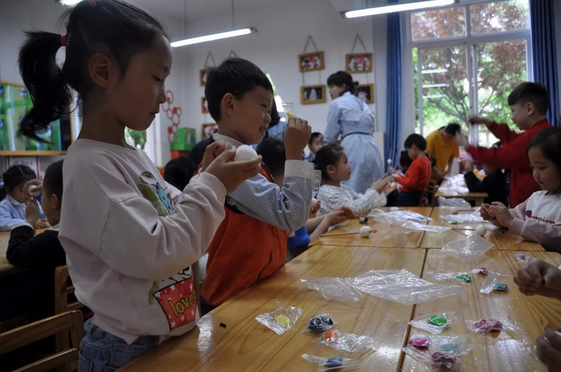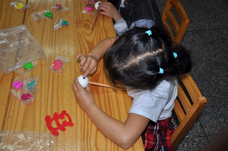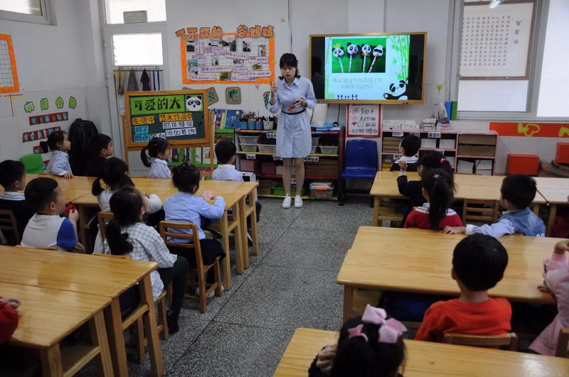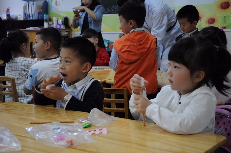 Ms. FuChao taught the children to make a giant panda on a pencil. Suddenly theordinary pencil became beautiful and lovely.