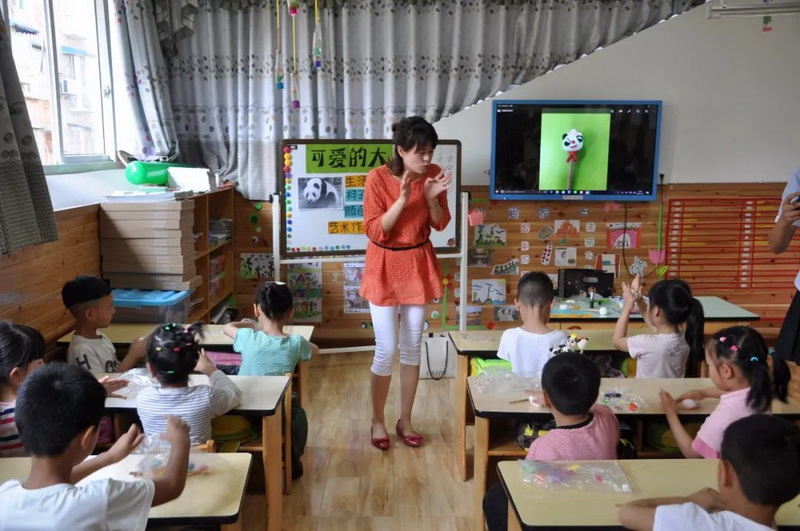 In“lovely pandas ”, Ms Fu Chao taught children to learn how to make giant panda's pen by making clay modeling.