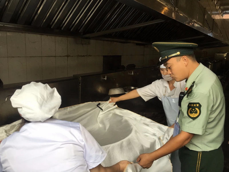 自查结束后,我校又接受了社区管理人员和市消防人员的检查,检查中,我校积极配合,消防人员随机从食堂员工中抽取了两名工作人员,进行了灭火毯的使用检查。检查过后,消防人员提出了一些技能指导,帮助我校食堂工作人员掌握更完善的消防技能。