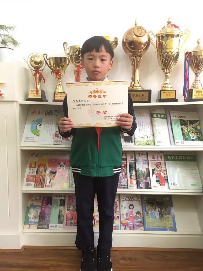 Chen Junan, Zhu Wangzhe, Zeng Ziling, Lan Zeyu, Chen Ziyan, Song Xinyuan, Lin Jinpeng and Xian Rui won prizes in"Writing Classics". Among them, Chen Junan from grade 3 won the special prize.