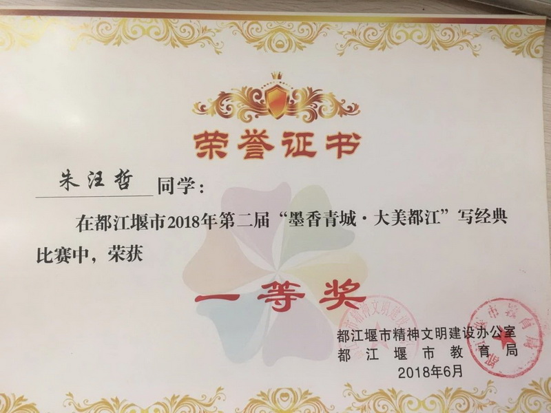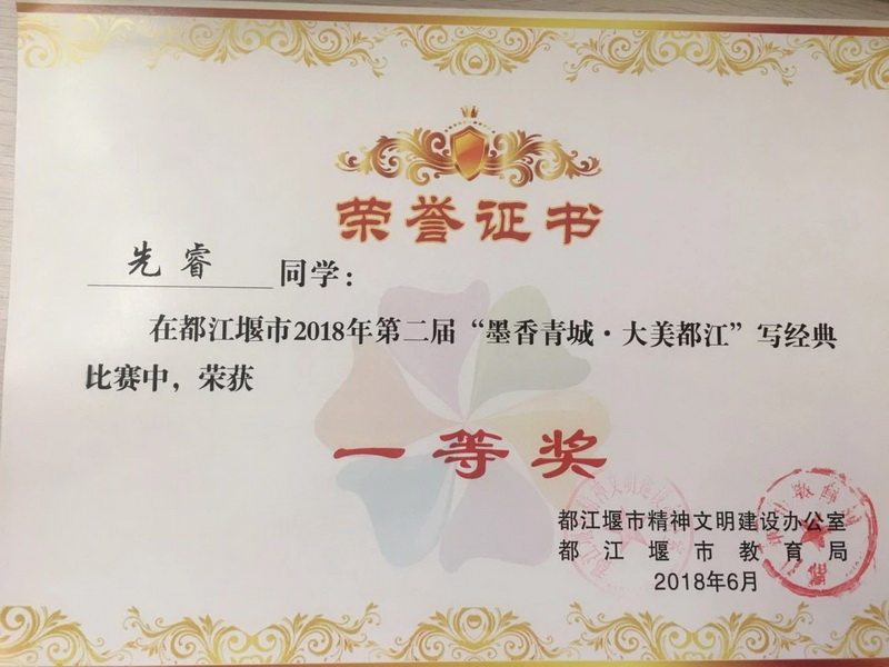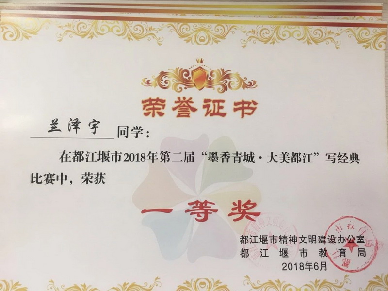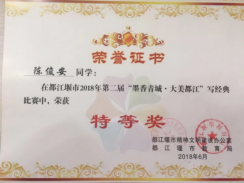 参加“墨香青城.大美都江”写经典活动,低段硬笔组陈俊安同学荣获都江堰特等奖;低段硬笔组朱汪哲荣获一等奖;软笔组曾子菱、兰泽宇荣获都江堰市一等奖;高段硬笔组笔陈子妍、宋馨园分别荣获都江堰市一等奖;高段软笔李金朋、先睿分别荣获都江堰市一等奖。