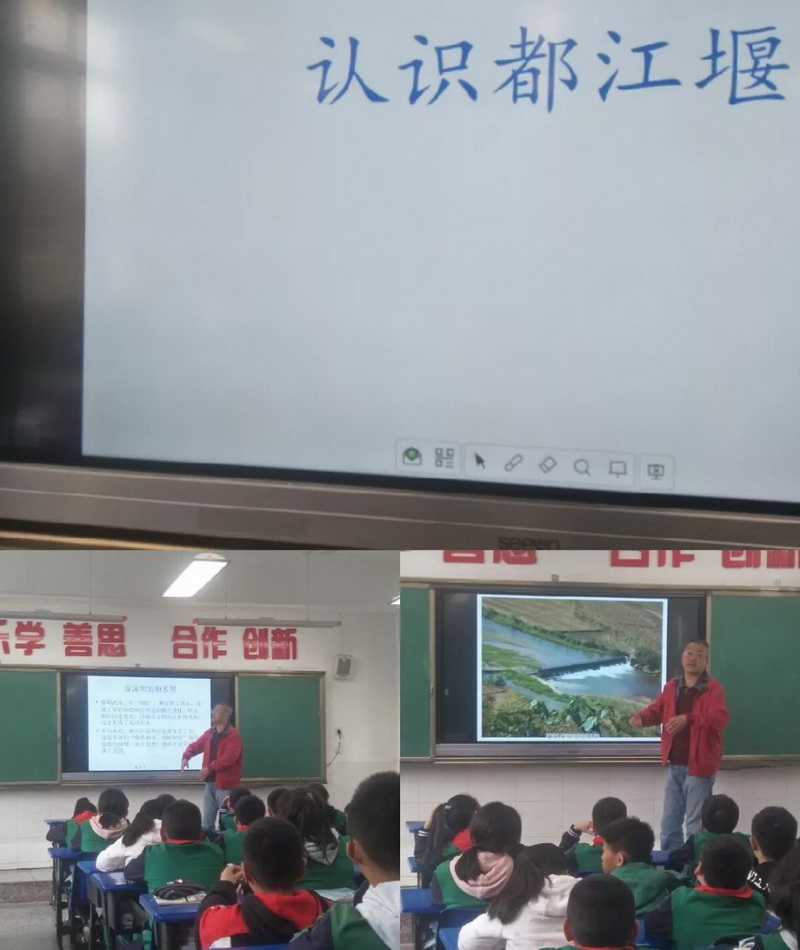 Director Fan, the retired director of the Bureau of Cultural Relics,introduced the Dujiangyan in detail for the children from "Why shouldDujiangyan be built, the historical name of Dujiangyan, etc."