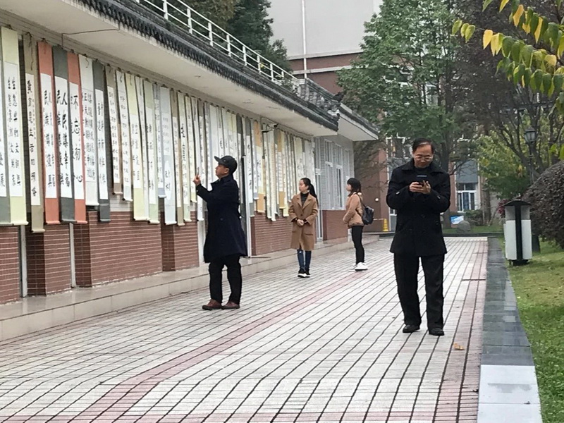 Principal Ma warmly welcomed all the visitors with thedirector MsXiang who guided them to visit. They visited our school campus environment, the socialist core values, hundred meters calligraphy wall, The Chinese character yong,consists eight different brush disciplines,water calligraphy corridor.They enjoyed the Calligraphy works of our teachers and students which were full of praise, then they went to the calligraphy classroom to gaincalligraphy education teaching experience from our teacher Mr WangZhengguo.