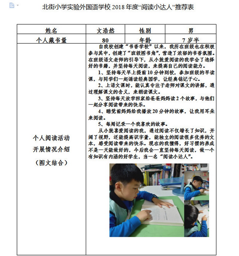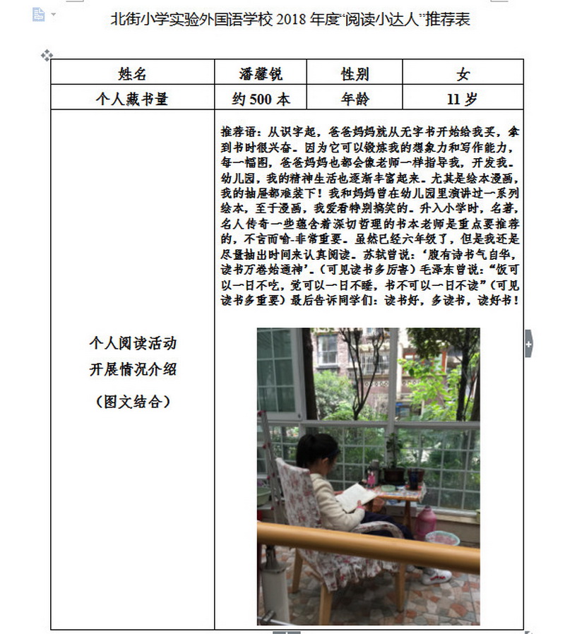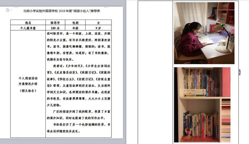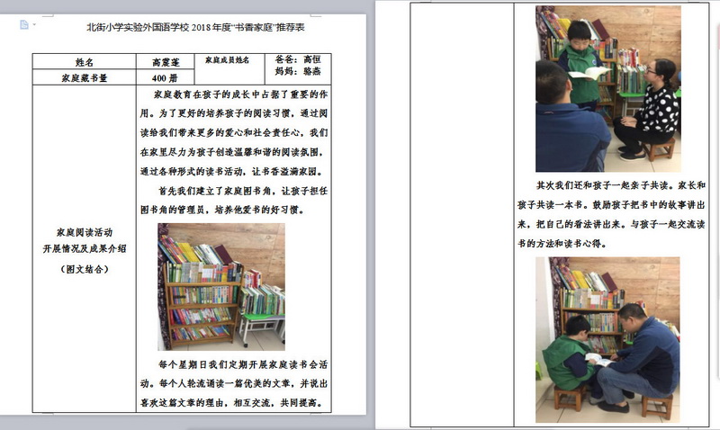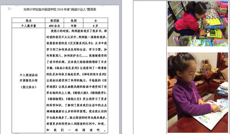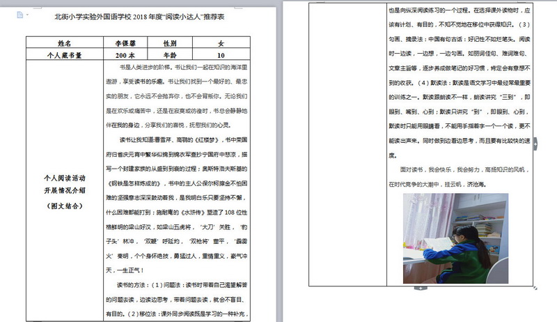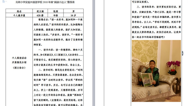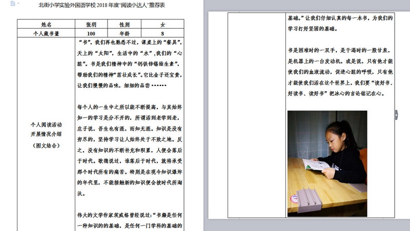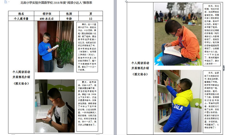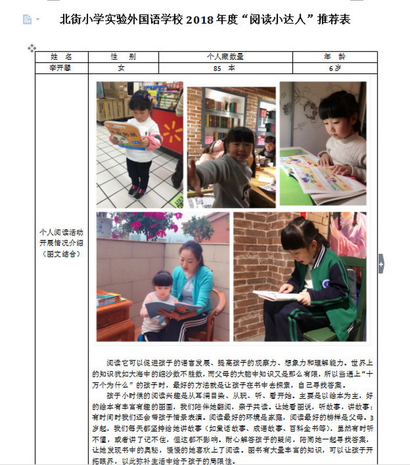 In order to makereading a habit of everyone in our school. Since 2017, our school has advocatedto all teachers, students and parents to calm down, hold up books and makereading a habit. Over the past two years, a number of outstanding children,excellent classes and excellent families have emerged.