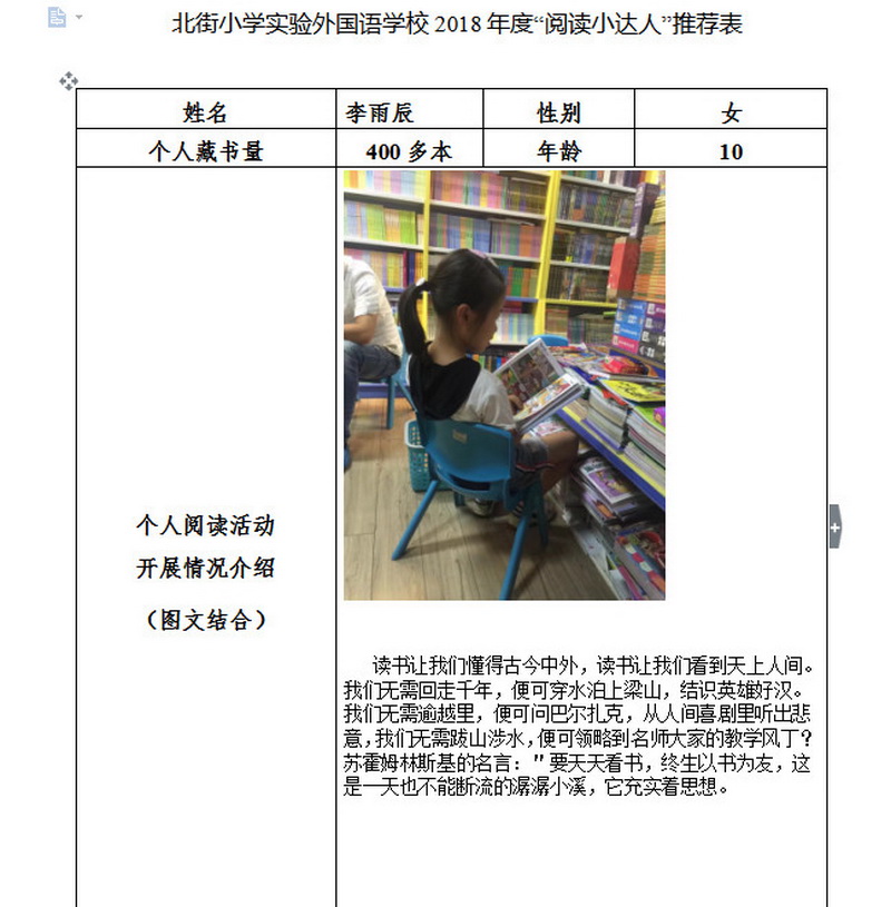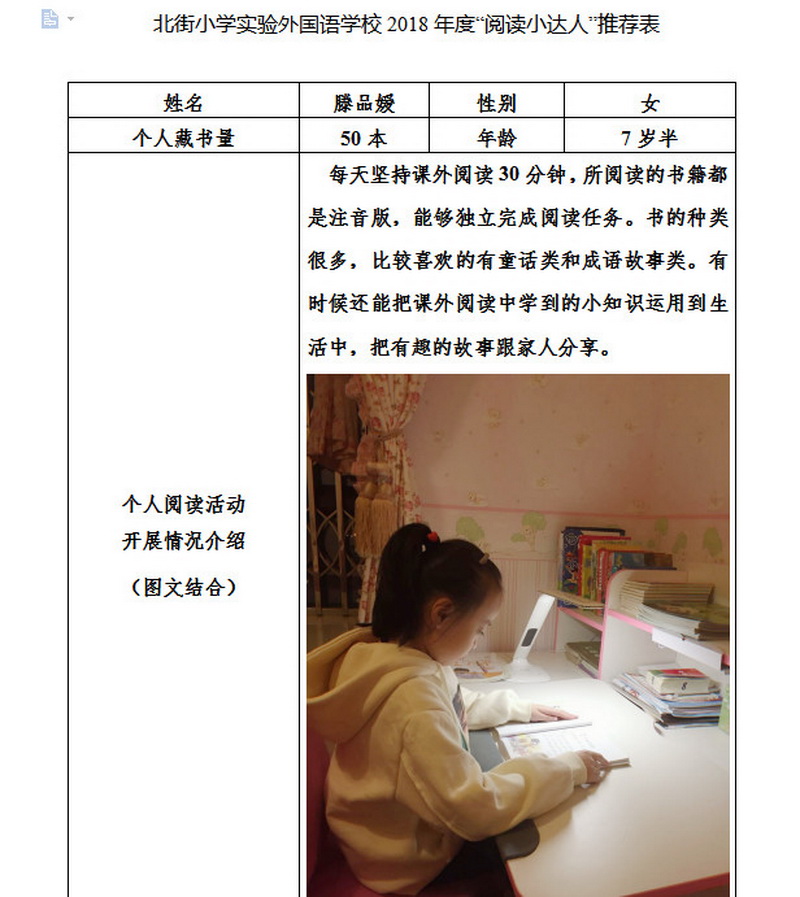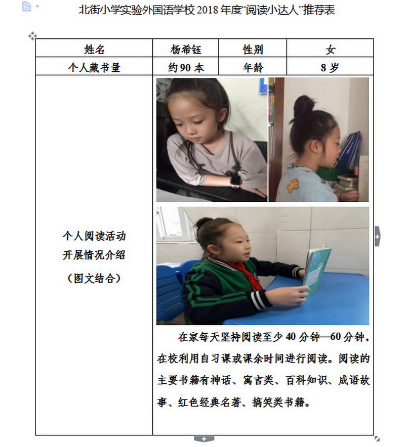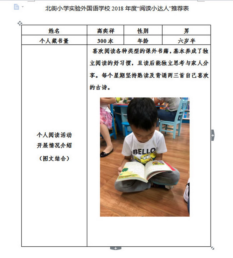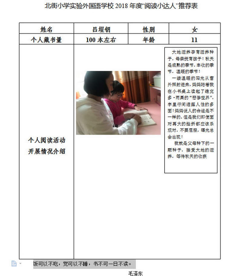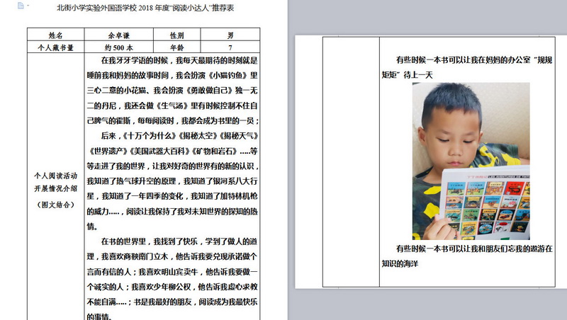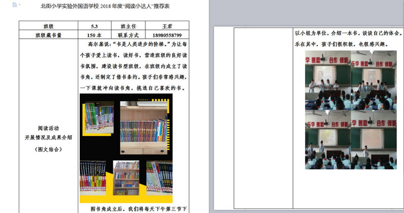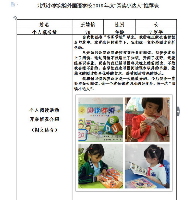 In order to makereading a habit of everyone in our school. Since 2017, our school has advocatedto all teachers, students and parents to calm down, hold up books and makereading a habit. Over the past two years, a number of outstanding children,excellent classes and excellent families have emerged.