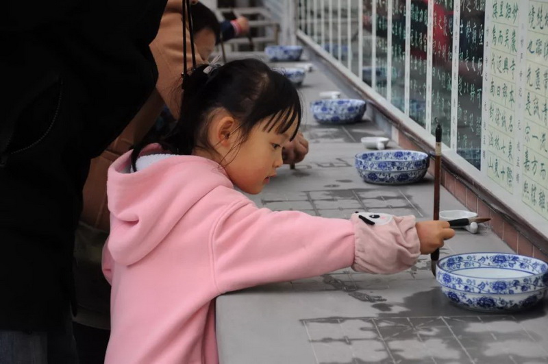 Then they came to the backyard and art building. Our calligraphy teachers were waiting for the children at the water desk where the students practiced calligraphy.