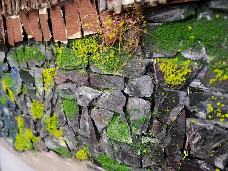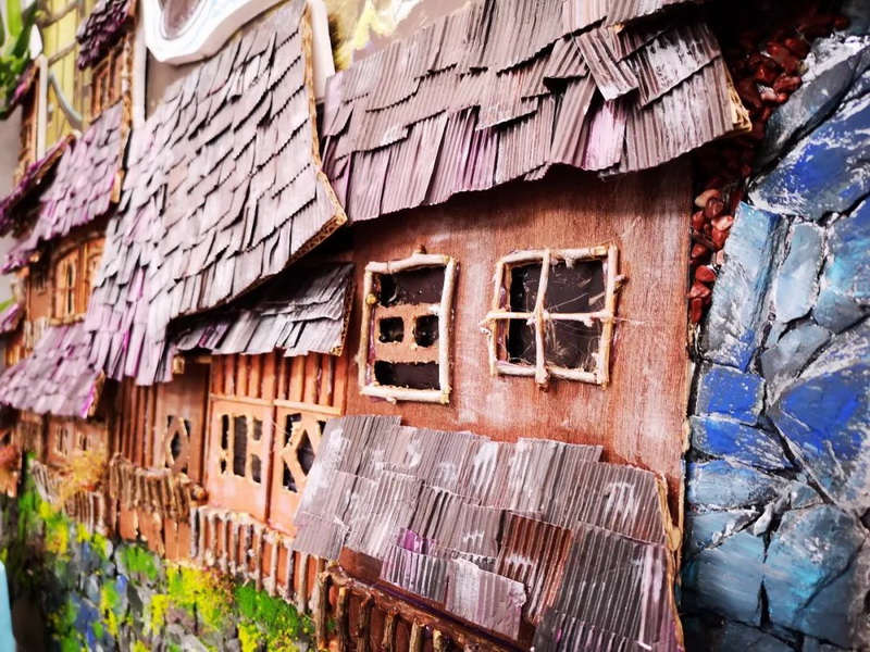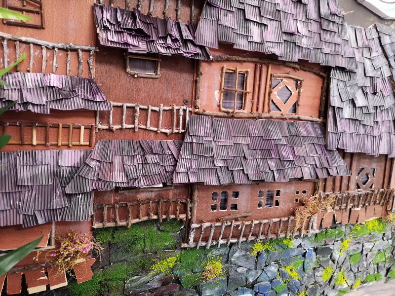 用木板、石片、瓦楞纸等综合材料制作都江堰古镇的房屋。