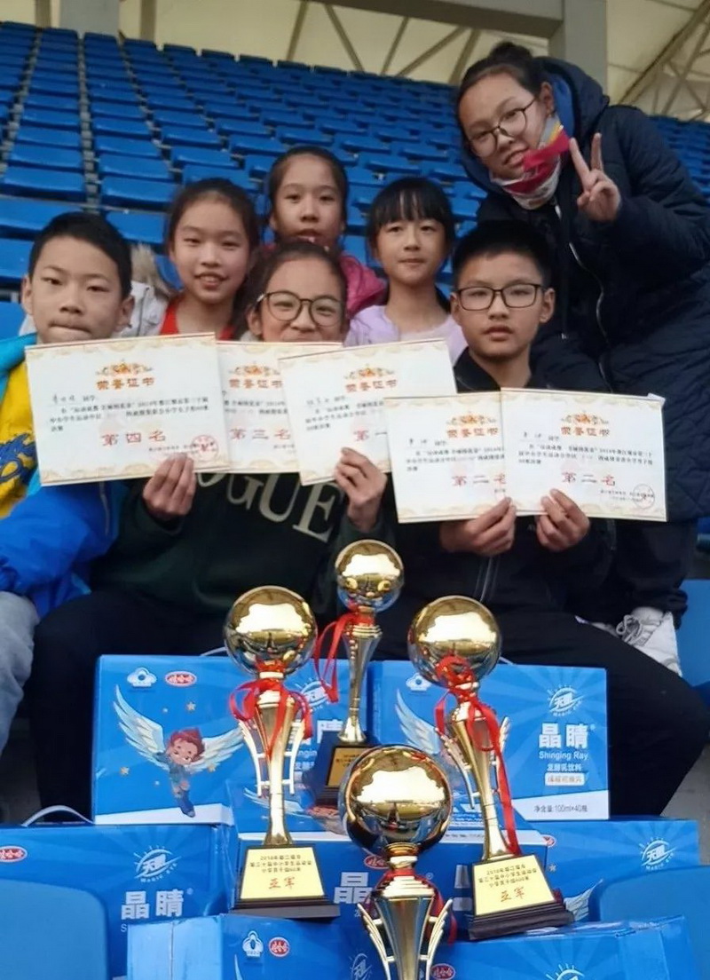 我校田径代表队员们通过平常的积极认真训练,分别获得了小学男子60米跑冠、季军,小学女子60米跑第四名,小学男子200米季军,小学男子跳高冠军,小学女子跳远亚 军、小学男子800米冠军、第八名,小学女子800米第六名,小学男子4x100米接力赛冠军等,最终我校以团体总分87分获得本次中小学生运动会的团体第一名!