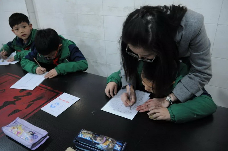 Recessive course display: children of Grade one lead their parents to visit the "I learn from myshow" homework exhibition.
