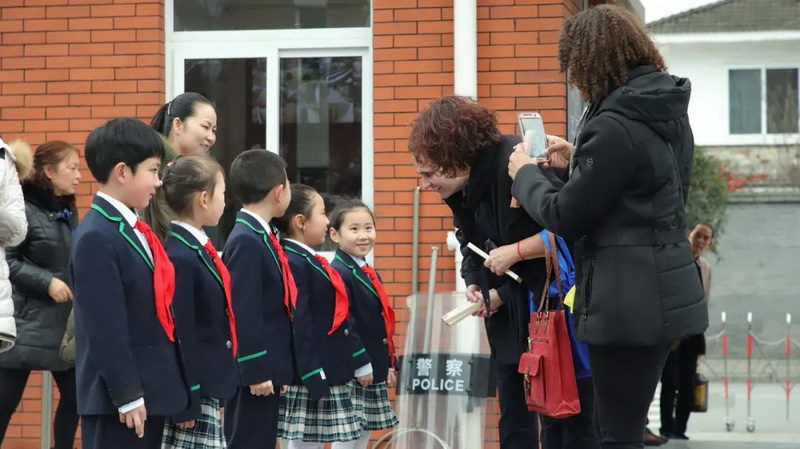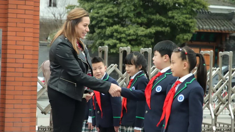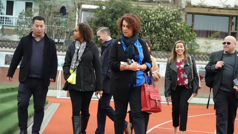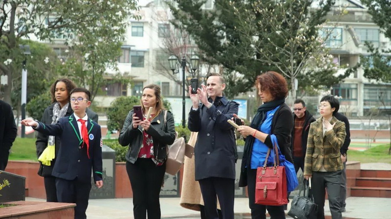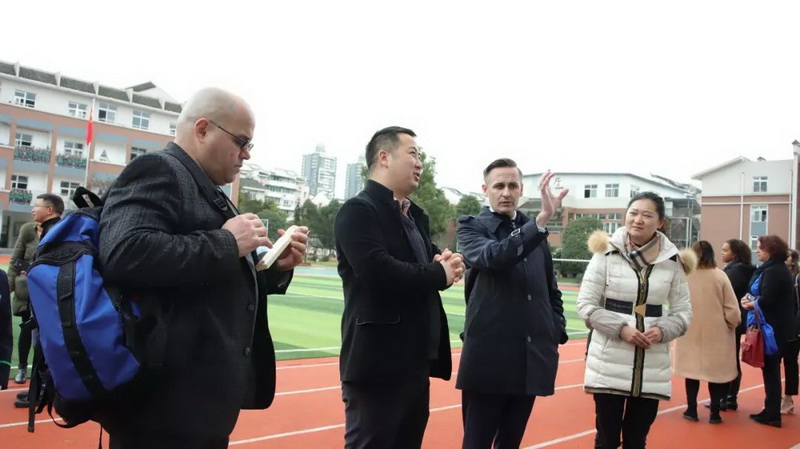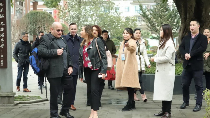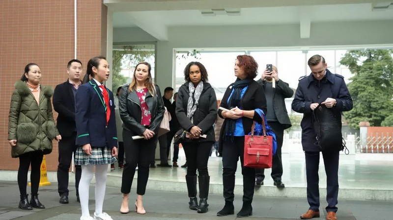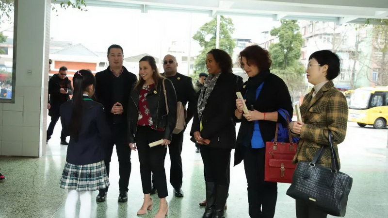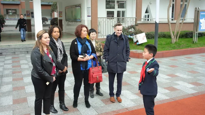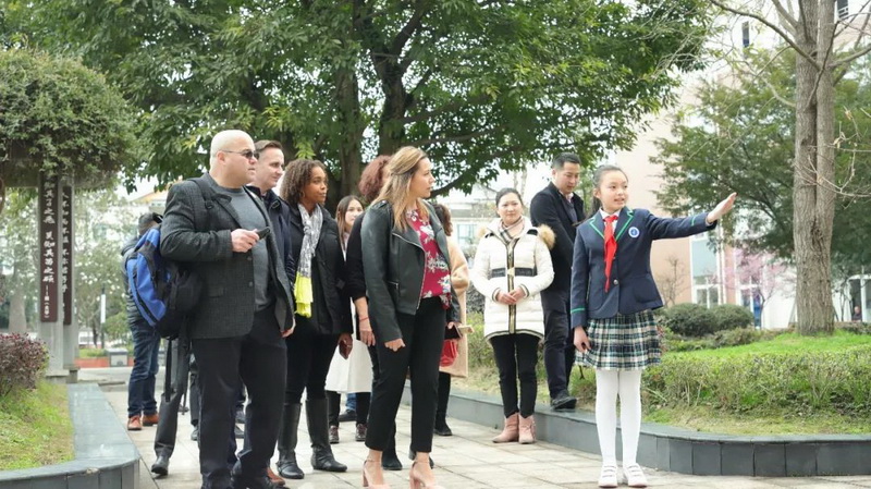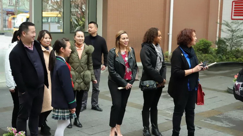 The guests visited our campus accompanied by Director Li Jianjun of the Foreign Exchange Office of Dujiangyan Education Bureau, our headmaster' soffice and English teachers. The students from all grades of our school introduced our campus environment and campus culture to the American headmasters.