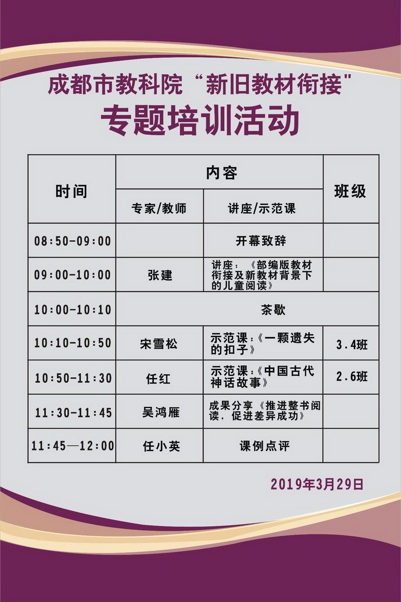 2019年3月29日,沐浴着和煦的春日暖阳,成都市教科院“新旧教材衔接专题培训”送培到都江堰活动在我校举行。