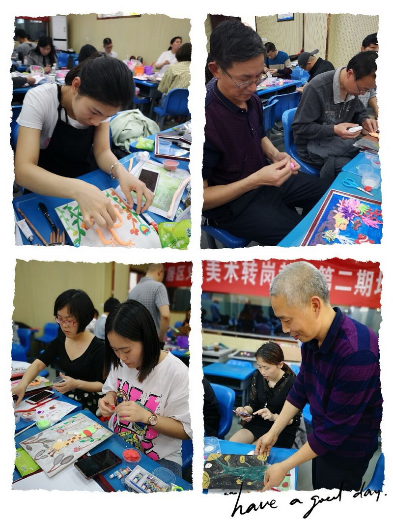 参加此次培训的老师年龄从二十多到五十多岁不等,他们从来没有接受过专业的美术教育和培训,但是在王老师耐心细致的讲解和培训下,老师们积极主动的动手实践操作,最后呈现的作品也丝毫不逊色。