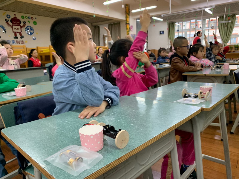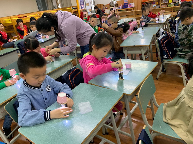Teacher Chen Nana's scientific innovation class, from the understanding of the battery positive and negative pole and various parts,to step by step careful assembly, under the guidance of the teacher and the children's hands-on operation, a small lamp in the classroom light, also children's hearts of the creative invention of the lamp.