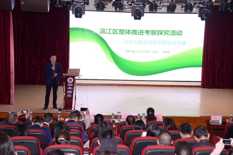 温江区东大街第一小学曾晓伟老师作《温江区整体推进考察探究的经验分享》。