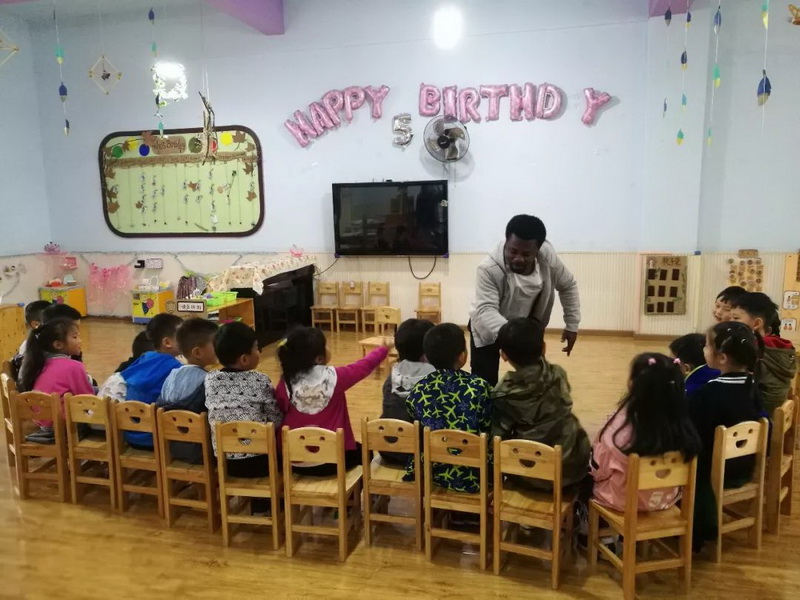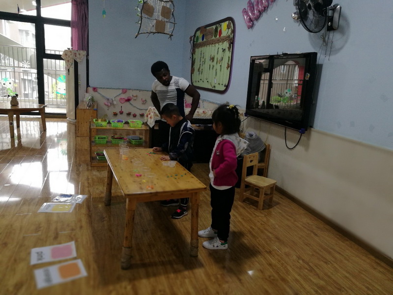 The English class brought by Evance, aforeign teacher, is lively and interesting. In the classroom, Evance brings thechildren the knowledge of spelling letters and color-related English throughthe interaction of songs and games. The children participate actively and the classroom atmosphere is very active.