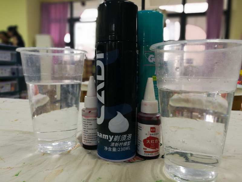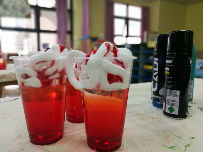 Ms. Liu of Science took the children together to make a fantastic "Snow Top Cup". The children found thatthe shaving foam is porous and heavy, and the heavy pigment can slowly penetrate the foam. When the pigment penetrates the foam into the water, thepigment starts to sink as the pigment is heavier than water. It's interesting that the pigments slowly dissolve and diffuse during the sinking process, and eventually form beautiful ribbons.