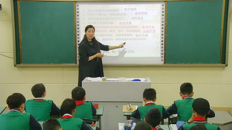 何勇老师与学生一起做语言的啄木鸟,探究病句的基本类型、修改方法、原则。